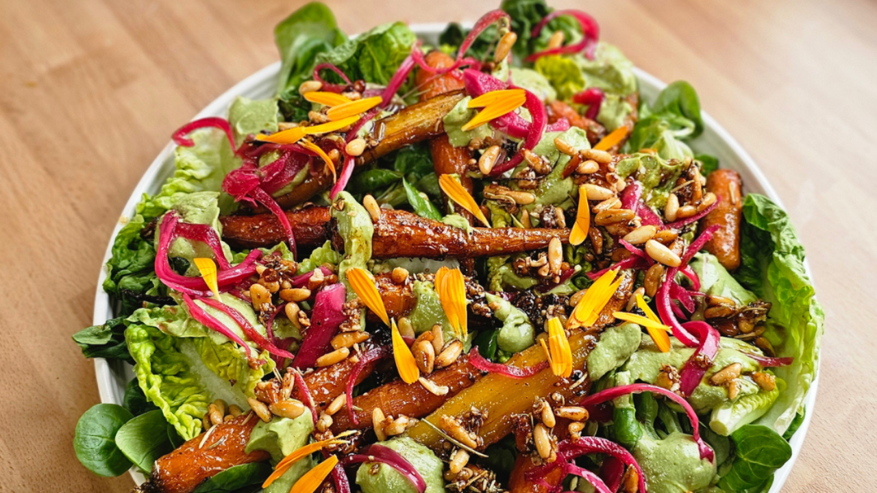 A warm, simple salad built around sweet roasted carrots, creamy herbal avocado sauce, and fresh greens. It’s rich but still fresh, with a good balance of sweetness, acidity, and herbs.